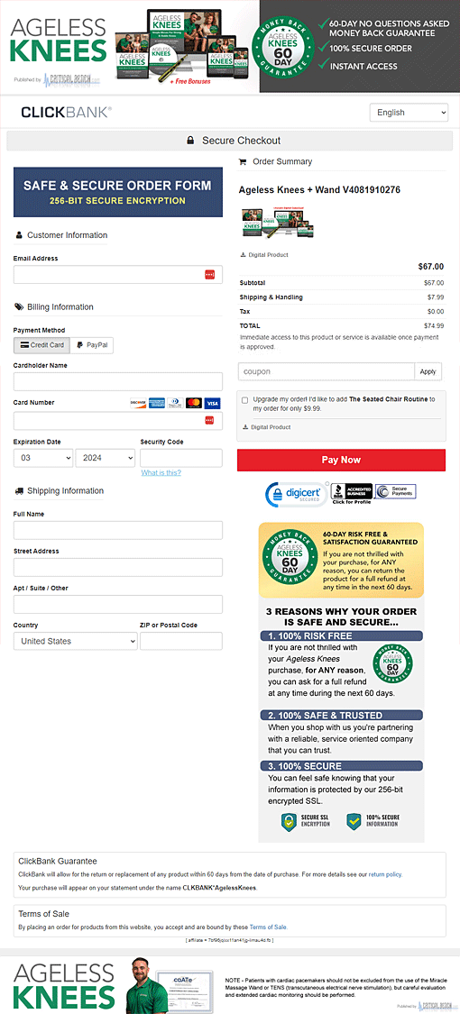 Get a digital copy of Ageless Knees and Bonuses via instant download from anywhere in the world.